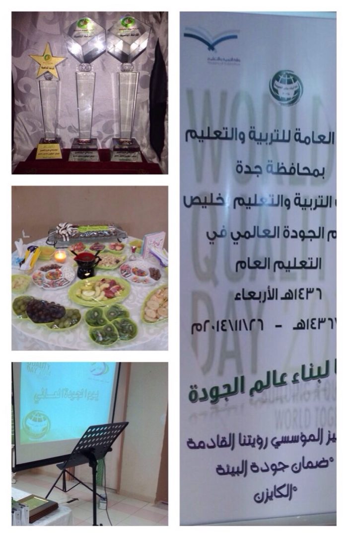 أقام مكتب التربية والتعليم بخليص (شؤون تعليم البنات) يوم الاربعاء الماضي 4 صفر 1436 من الهجرة حفلا تربويا تحت شعار” معا لبناء عالم الجودة” بقيادة الأستاذة منى المحمادي مشرفة الجودة الشاملةوذلك في والذي يهدف الى تعميق مفاهيم الجودة والتحسين المستمر ونشر ثقافة التميز المؤسسي .