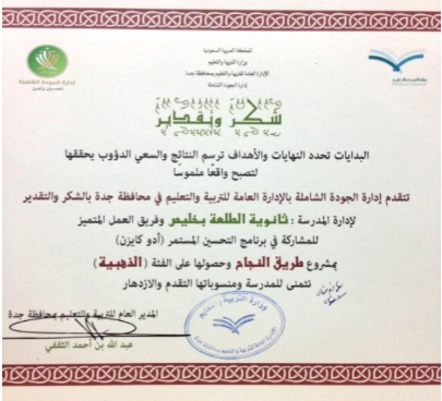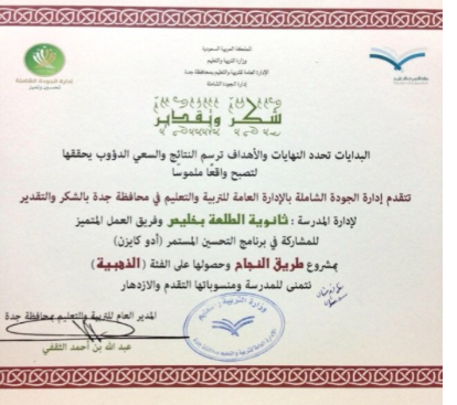 كما حصلت ثانوية الطلعة بخليص على وسام الفئة الماسية أثر المشاركة في برنامج التحسين المستمر ‘الادوكايزن’ بمشاريعها الثلاث متمثلة في “العهد الالكترونية “و “طريق النجاح”و” نحو تعليم أفضل”