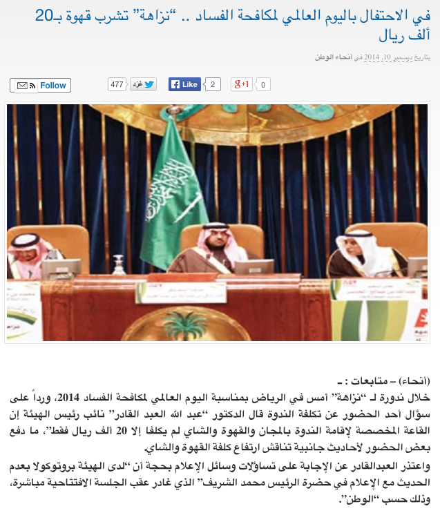 تجدر الإشارة إلى أن نائب رئيس الهيئة الوطنية لمكافحة الفساد نزاهة الدكتور عبدالله العبدالقادر، كشف أن نزاهة دفعت 20 ألف ريال ثمنًا للقهوة التي شربها الحضور في ندوة دور المؤسسات الإعلامية والثقافية في تعزيز النزاهة ومكافحة الفساد، التي نظمتها نزاهة بالرياض.