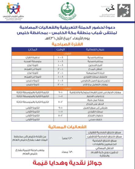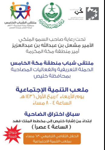 يزور ملتقى شباب منطقة مكة الخامس محافظة خليص يوم الأربعاء القادم ( ٢ ربيع الأول ١٤٣٦ هـ) حيث يقوم بحملة تعريفية حول الملتقى ويعقد عدد من الأنشطة والفعاليات المصاحبة في الفترة الصباحية والمسائية وتشمل محاضرات وورش عمل وبرامج صحية وتوعية في عدد من مدارس الأولاد والبنات. وفي الفترة المسائية يقام سباق للضاحية الساعة ٠٤:٣٠ وبعد المغرب حفل ثقافي بملعب التنمية الاجتماعية بالدف وتدشين دوري كرة القدم وكرة الطائرة.