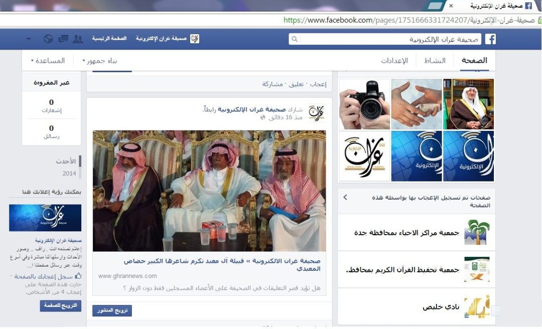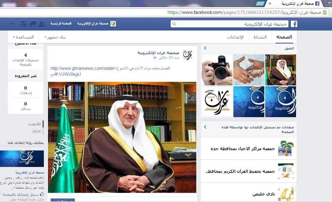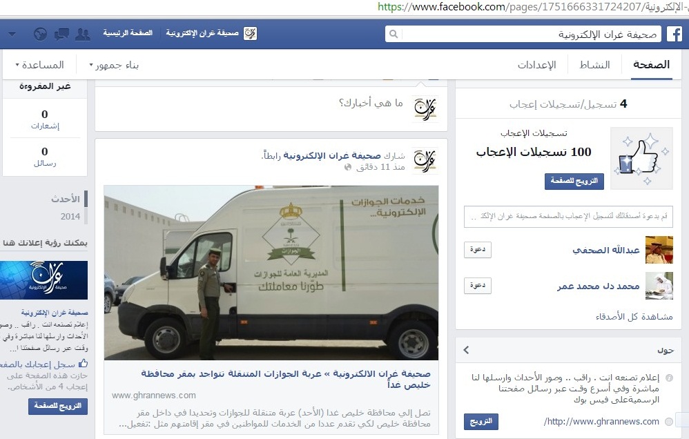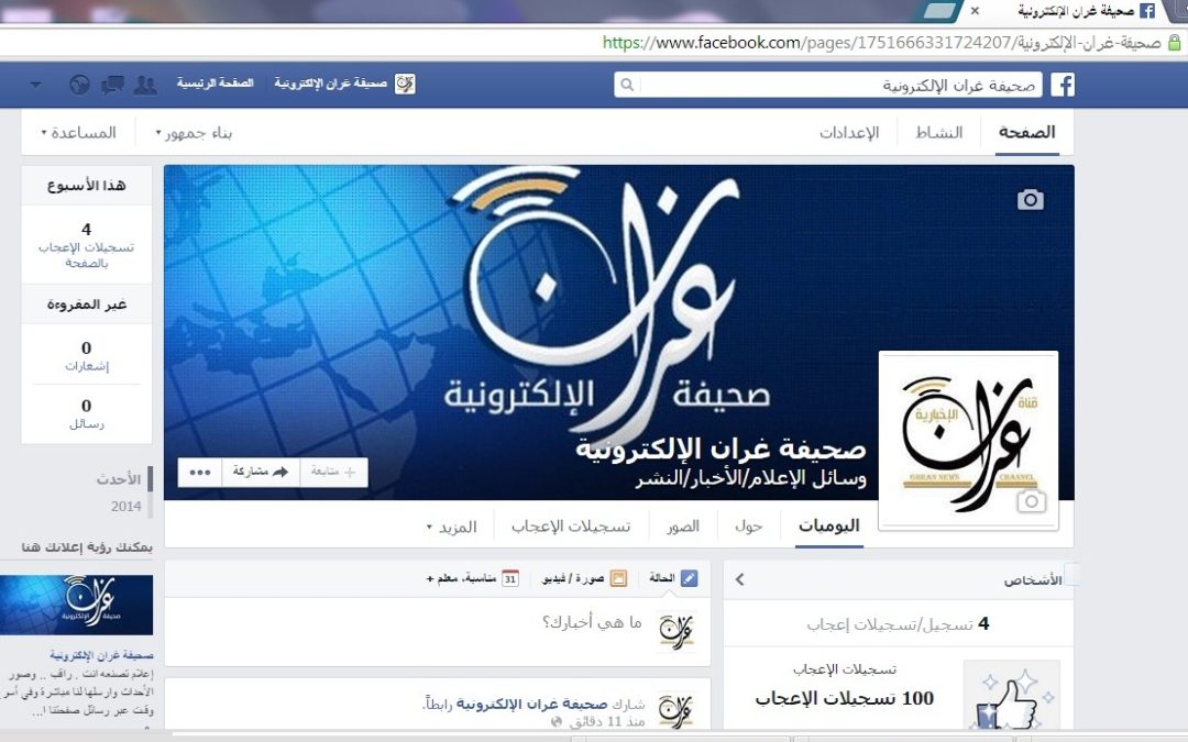 صحيفة غراس الالكترونية > متفرقات > تدشين الصفحة الرسمية للصحيفة على الفيس بوك تدشين الصفحة الرسمية للصحيفة على الفيس بوك الكاتب: الإدارة 21 ديسمبر, 2014م 1 10818 تم بحمد الله افتتاح الصفحة الرسمية للصحيفة على موقع التواصل الاجتماعي الفيس بوك على الرابط https://www.facebook.com/pages/Ghran-Presse/1751666331724207?ref=hl نتشرف بدعوتكم لزيارة الصفحة الجديدة وإبداء أرائكم ونتمنى ان تتركوا بصمتكم بإعجابكم بصفحتنا لكي يصلكم كل جديد من أخر الأخبار والمواضيع التي يتم نشرها في الصحيفة تباعاً كما تجدون عليها محتوى حصري من النقاشات و استطلاعات للرأي ندعوكم لمتابعة و تتبع الصفحة ومن لديه أي أفكار لتطويرها يمكنه إشعارنا عبر رسائل الصفحة على الفيس بوك