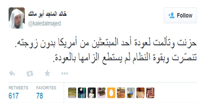 وكان الماجد قد غرد عبر حسابه في “تويتر”، قائلاً “حزنت وتألمت لعودة أحد المبتعثين من أمريكا من دون زوجته.. تنصَّرت وبقوة النظام لم يستطع إلزامها بالعودة، وقد اعتنقت النصرانية بعد تأثرها بعاملة إفريقية”.