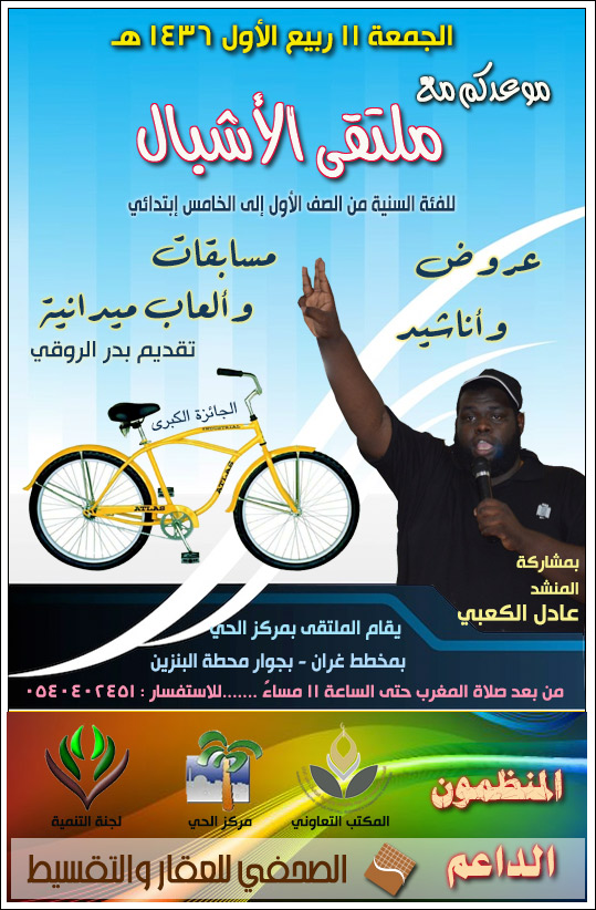 يقام يوم الجمعة القادم (١١ ربيع الأول) ملتقى للأشبال للفئة السنة من الصف الأول حتى الصف الخامس الإبتدائي بمركز أحياء غران ويشتمل الملتقى على ألعاب ميدانية وعروض ومسابقات وأناشيد حيث يستضيف الملتقى كلا من المنشد المشهور عادل الكعبي ومقدم المسابقات والألعاب بدر الروقي.