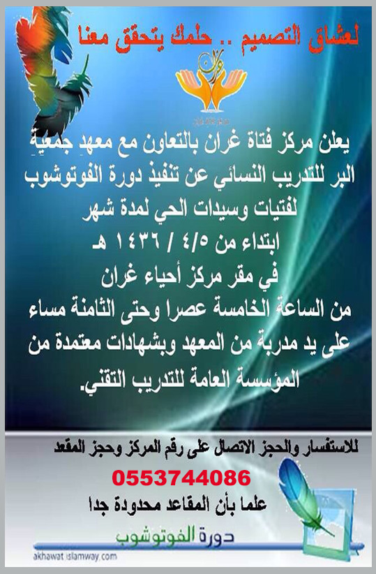 يعقد مركز فتاة غران بالتعاون مع معهد جمعية البر للتدريب النسائي بخليص دورة في التصميم بواسطة برنامج “الفوتوشوب” لفتيات وسيدات الحي ابتداء من ٤/٥ / ١٤٣٦هـ ولمدة شهر كامل من الساعة الخامسة عصرا وحتى السابعة مساء على يد مدربة من المعهد وبشهادات معتمدة من المؤسسة العامة للتدريب التقني.