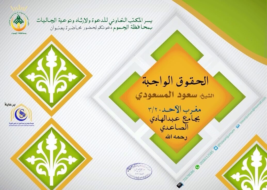 صحيفة غراس الإلكترونية > الأخبار المحلية > المسعودي يحاضر عن “الحقوق الواجبة” بجامع الصاعدي بالجموم غداً المسعودي يحاضر عن “الحقوق الواجبة” بجامع الصاعدي بالجموم غداً الكاتب: أحمد الصحفي 10 يناير, 2015م 0 14951 ينظم المكتب التعاوني للدعوة والإرشاد وتوعية الجاليات بمحافظة الجموم محاضر للشيخ سعود المسعودي بعنوان “الحقوق الواجبة”بعد مغرب يوم غد (الأحد) بجامع عبدالهادي الصاعدي بالجموم.