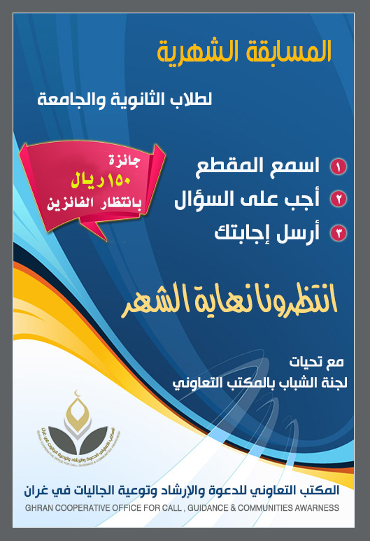 كما أطلقت اللجنة أولى مسابقاتها الشهرية التي تستهدف طلاب الثانوية والجامعة من خلال طرح سؤال تكون الإجابة عليه من خلال الاستماع أو مشاهدة المقطع الذي يتم إساله عبر جوال المكتب التعاوني ورصدت اللجنة جائزة نقدية للفائز في كل شهر.