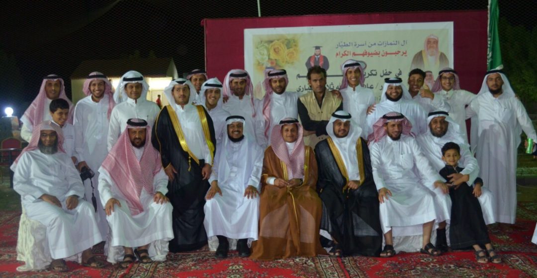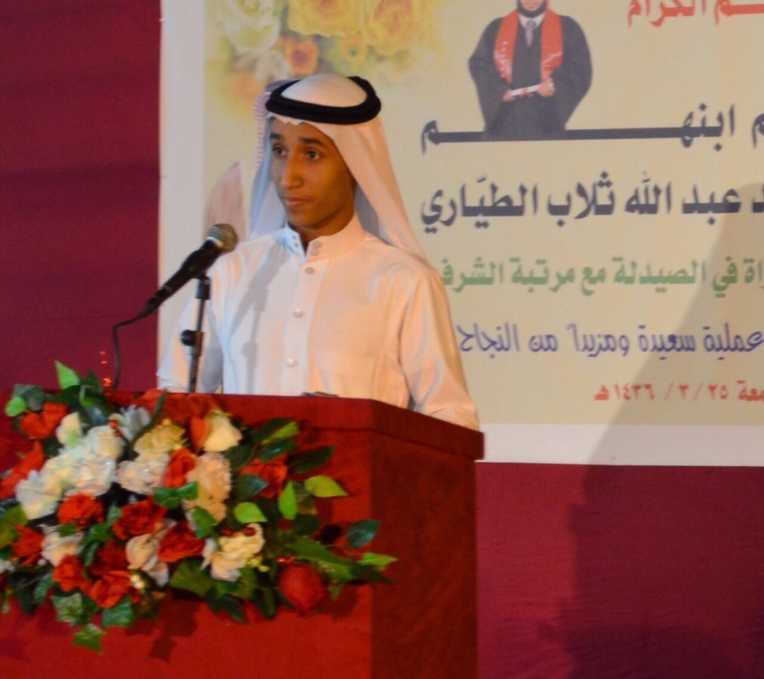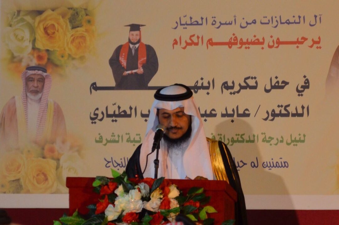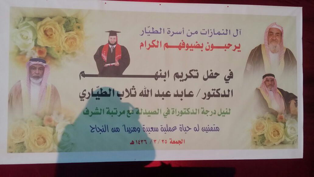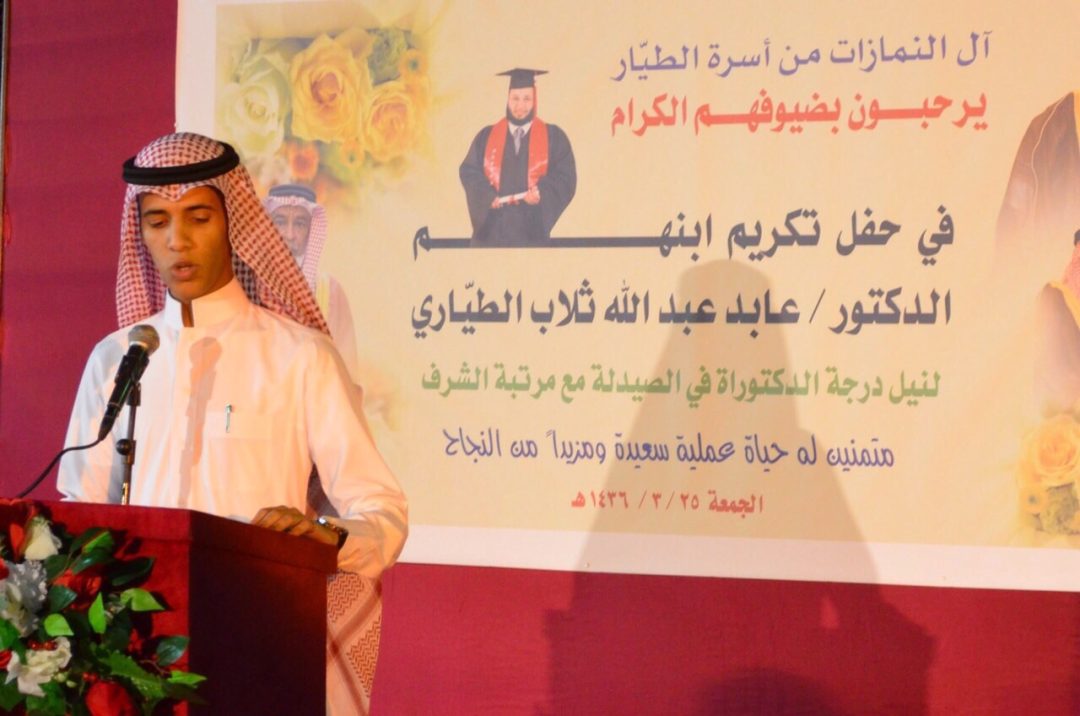 انطلاقاً من مبدأ الإهتمام بالنجاح والتشجيع بالتفوق العلمي، وفي ليلة من ليالي الوفاء، وفي أجواء سادها الفرح والسرور، بفضل الله أقام آل النمازات من أسرة الطيار بخليص وعلى رأسهم الشيخ عوض بن عبدالحافظ الطياري، والشيخ محمد بن عبدالحفيظ الطياري، حفل تكريم ابنهم سعادة الدكتور عابد بن عبدالله بن ثلاب الطياري، بمناسبة حصوله على درجة الدكتوراه في الصيدلة (Pharm.D)، وذلك مساء يوم الجمعة الموافق 25-03-1436هـ، وقد تخلل الحفل عدد من الفقرات.