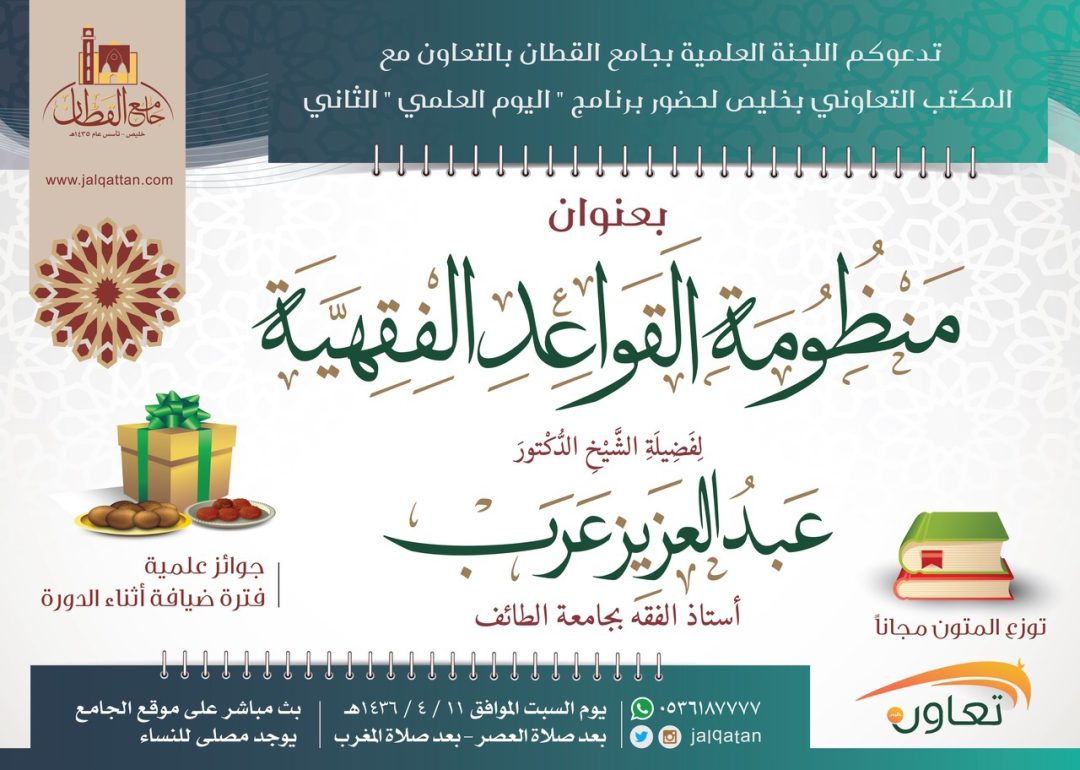ضمن أنشطة اللجنة العلمية بجامع القطان وبالتعاون مع المكتب التعاوني للدعوة والإرشاد بخليص يستضيف جامع القطان فضيلة الشيخ د.عبدالعزيز بن سعود عرب عضو الإفتاء بالمسجد الحرام وأستاذ الفقه بجامعة الطائف في اليوم العلمي الثاني بالجامع بعنوان شرح منظومة القواعد الفقهية لابن سعدي يوم السبت الموافق ١١-٤-١٤٣٦هــ بعد صلاة العصر وبعد صلاة المغرب وسيوزع متن الدورة مجانا كما ستكون هناك جوائز للمشاركين وستتخلل الدورة فترة ضيافة.