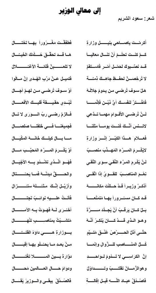 صحيفة غراس الالكترونية > شعر وشعراء > إلى معالي الوزير إلى معالي الوزير الشاعر: الشيخ سعود الشريم 31 يناير, 2015م 1 2397