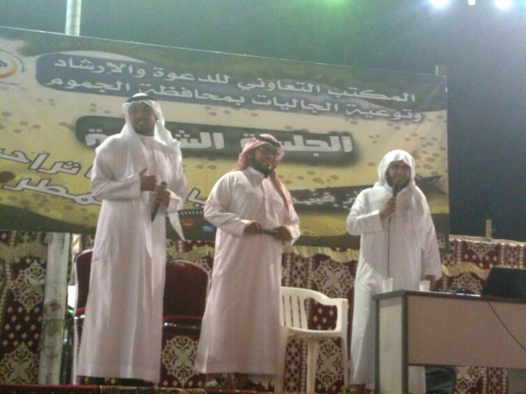 كل ذلك كان ضمن الجلسة الشبابية التي نظمها المكتب التعاوني للدعوة والإرشاد بمحافظة الجموم يوم أمس (الجمعة) حيث بدأت أولي فعاليات الجلسة الشبابية مع الداعية مشعان البقمي بكلمة توجيهية للشباب .. تلا ذلك مشاركات إنشادية من منشد فرقة قمم ونجم قناة المجد عبدالرحمن قاسم تفاعل معها الحضور الذين فاق ٣٠٠ من داخل المحافظة وخارجها و رددوا مع المنشد الأهازيج الحجازية والشامية