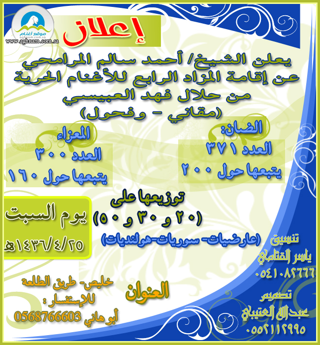 صحيفة غراس الإلكترونية > الأخبار المحلية > مزاد علني للأغنام الحرية بخليص على ٦٧١ رأس من الضأن والمعز مزاد علني للأغنام الحرية بخليص على ٦٧١ رأس من الضأن والمعز الكاتب: أحمد الصحفي 01 فبراير, 2015م 0 21051 أعلن الشيخ أحمد سالم المرامحي عن إقامة مزاد علني للأغنام الحرية بخليص – طريق الطلعة يوم السبت ٢٥ من الشهر الجاري على ٦٧١ رأس من الضأن والمعز حسب التفاصيل بالإعلان أدناه.