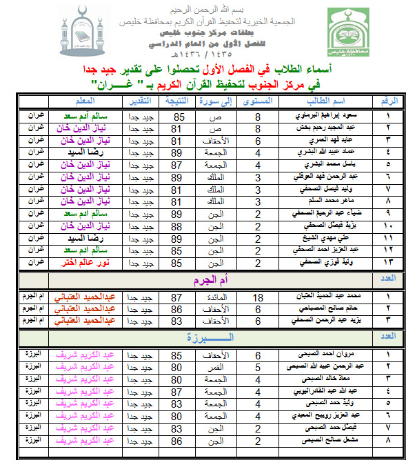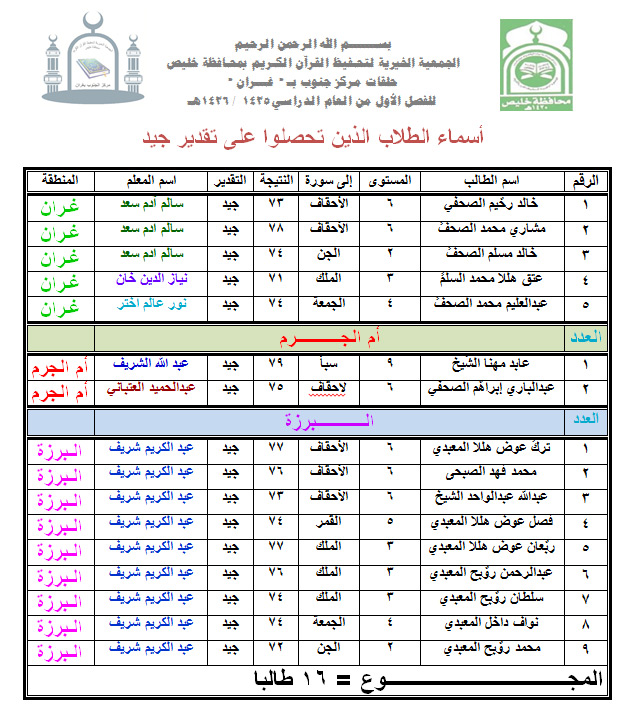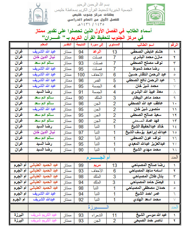 صحيفة غراس الإلكترونية > الأخبار المحلية > إعلان نتائج طلاب التحفيظ بغران و ٢٧ طالباً يحصلون على تقدير ممتاز إعلان نتائج طلاب التحفيظ بغران و ٢٧ طالباً يحصلون على تقدير ممتاز الكاتب: نافع نفيع الصحفي 02 فبراير, 2015م 1 25819 أعلن مركز الجنوب لتحفيظ القرآن الكريم بـغران أسماء الطلاب الذين اجتازوا امتحان الحفظ الذي أجراه المركز خلال الفصل الأول، وقد حصل ٢٧ طالباً على تقدير ممتاز منهم ١٨ طالباً من حلقات التحفيظ بغران و ٧ طلاب من حلقات أم الجرم و طالبان من حلقة التحفيظ بالبرزة. وفيما يلي أسماء الطلاب :