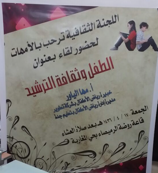 تنضم اللجنة الثقافية بمحافظة خليص التابعة للنادي الأدبي الثقافي بجدة مساء اليوم (الجمعة) محاضرة نسائية بعنوان (الطفل وثقافة الترسيد) تلقيها الأستاذة مها الياور خبيرة رياض اﻷطفال بشركة تطوير ومديرة إدارة رياض اﻷطفال بتعليم جدة. تقام المحاضرة بعد صلاة العشاء بقاعة روضة الرميصاء بحي المغاربة بخليص. ،و الدعوة عامة لجميع النساء.