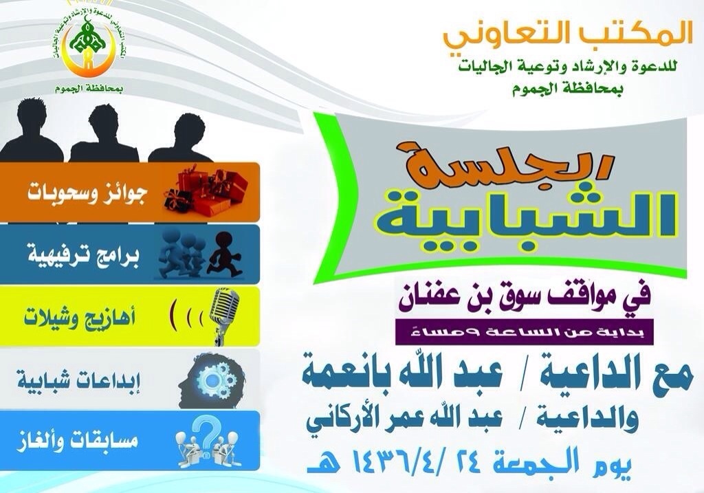 بعد النجاح الكبير الذي حققته الجلسة الشبابية الأولى التي أقامها المكتب التعاوني للدعوة والإرشاد وتوعية الجاليات بمحافظة الجموم ، يقيم المكتب جلسة شبابية ثانية يوم الجمعة ٢٤ من الشهر الجاري بمواقف سوق ابن عفنان الساعة التاسعة مساءً، ويستضيف فيها كل من الداعية عبدالله بانعمة والداعية عبدالله عمر الأركاني.
