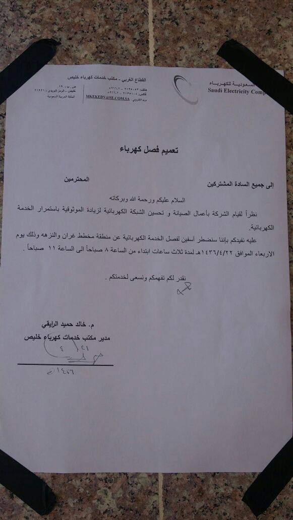 تأذى المصلون في مخطط غران وحي النزهة من فصل التيار الكهربائي قبل إقامة صلاة الفجر بدقائق مما جعلهم يؤدون الصلاة في الظلام ومن دون ميكروفونات. الجدير بالذكر أن شركة كهرباء خليص أصدرت يوم أمس تعميماً تفيد فيه بفصل التيار عن مخطط غران والنزهة لمدة ٣ ساعات من الساعة ٨ صباحاً حتى ١١ صباحاً للقيام ببعض أعمال الصيانة ولكنها أخلفت الموعد وفصلت التيار قبل موعده بساعتين مما توافق مع صلاة الفجر وكان الأجدر بالشركة مراعاة وقت صلاة الفجر والالتزام بالموعد الذي حددته للفصل.