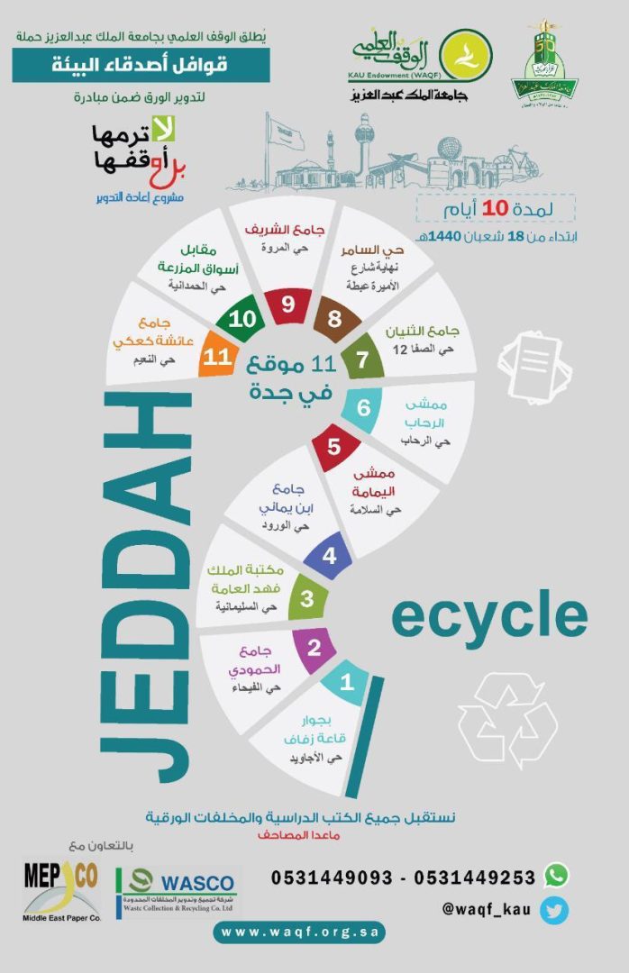 أطلق الوقف العلمي بجامعة الملك عبدالعزيز حملة لجمع فائض الكتب المدرسية والمخلفات الورقية ضمن مبادرة “قوافل أصدقاء البيئة” تحت عنوان “لاترمها .. بل أوقفها” مشروع إعادة التدوير. وتستمر الحملة من ١٨ شعبان لمدة ١٠ أيام. وقد تم تخصيص ١١ موقعاً في مدينة جدة لاستقبال الكتب المدرسية ومخلفات الورق كما هو موضوح في البوستر إدناه :
