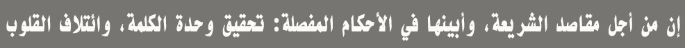إن من أجل مقاصد الشريعة، وأبينها في الأحكام المفصلة: تحقيق وحدة الكلمة، وائتلاف القلوب، ويكاد أن ينتظم ذلك في كل أبواب الشريعة في العبادات والمعاملات والآداب، بل حتى في العقوبات.