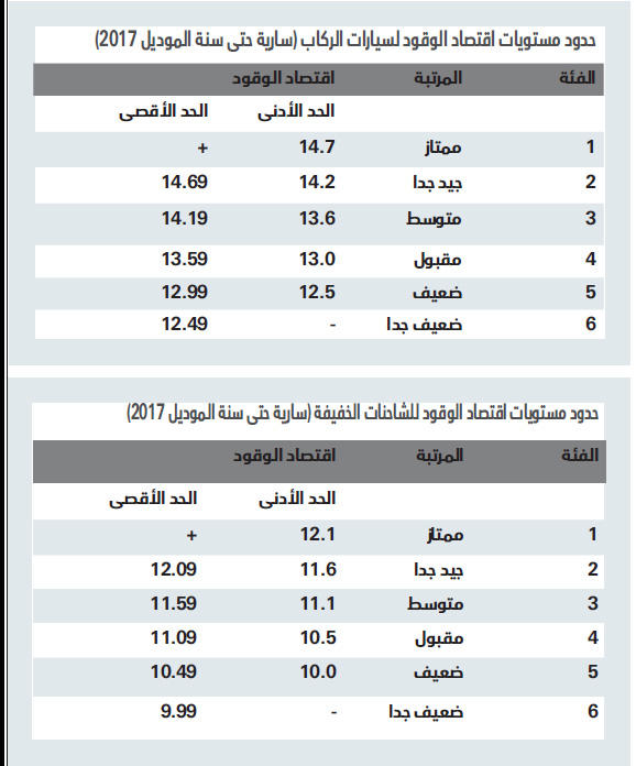 وفي حال عدم وجود بطاقة اقتصاد الوقود على المركبة الخفيفة الجديدة المستوردة ابتداء من 1 كانون الثاني (يناير) 2015 فإن هذا يعتبر مخالفا للوائح وزارة التجارة ويجب تبليغ وزارة التجارة حتى تتخذ معه الإجراء اللازم.