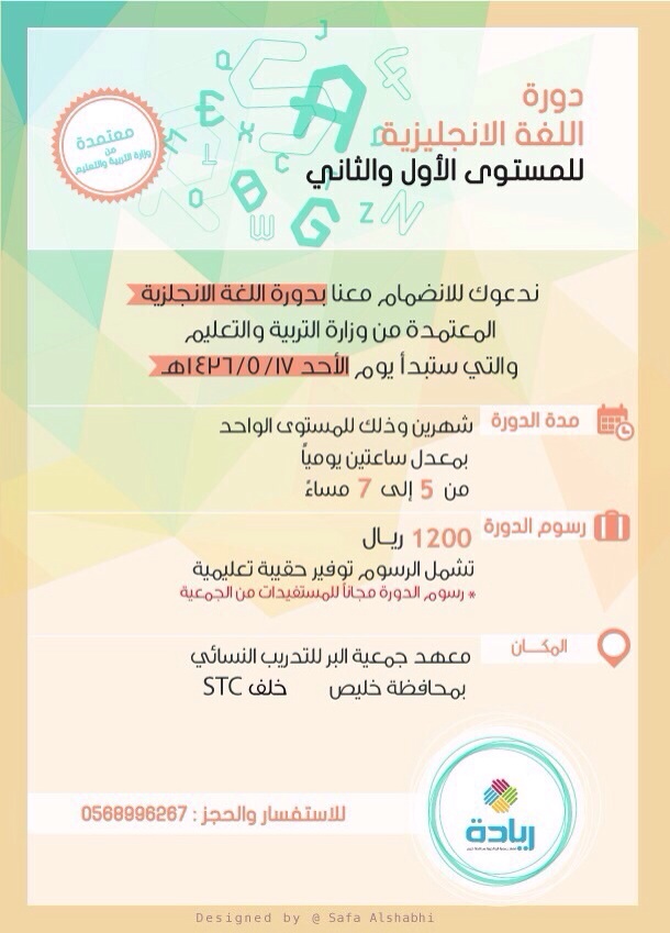 أعلن معهد جمعية البر للتدريب النسائي عن إقامة دورة في اللغة الإنجليزية للسيدات (للمستوى الأول والثاني) لمدة شهرين تبدأ يوم الأحد ١٧ جمادى الأول بمعدل ساعتين كل يوم من الساعة الخامسة حتى السابعة مساءً بمقر المعهد بحي الدف بخليص. حسب التفاصيل بالإعلان أدناه :