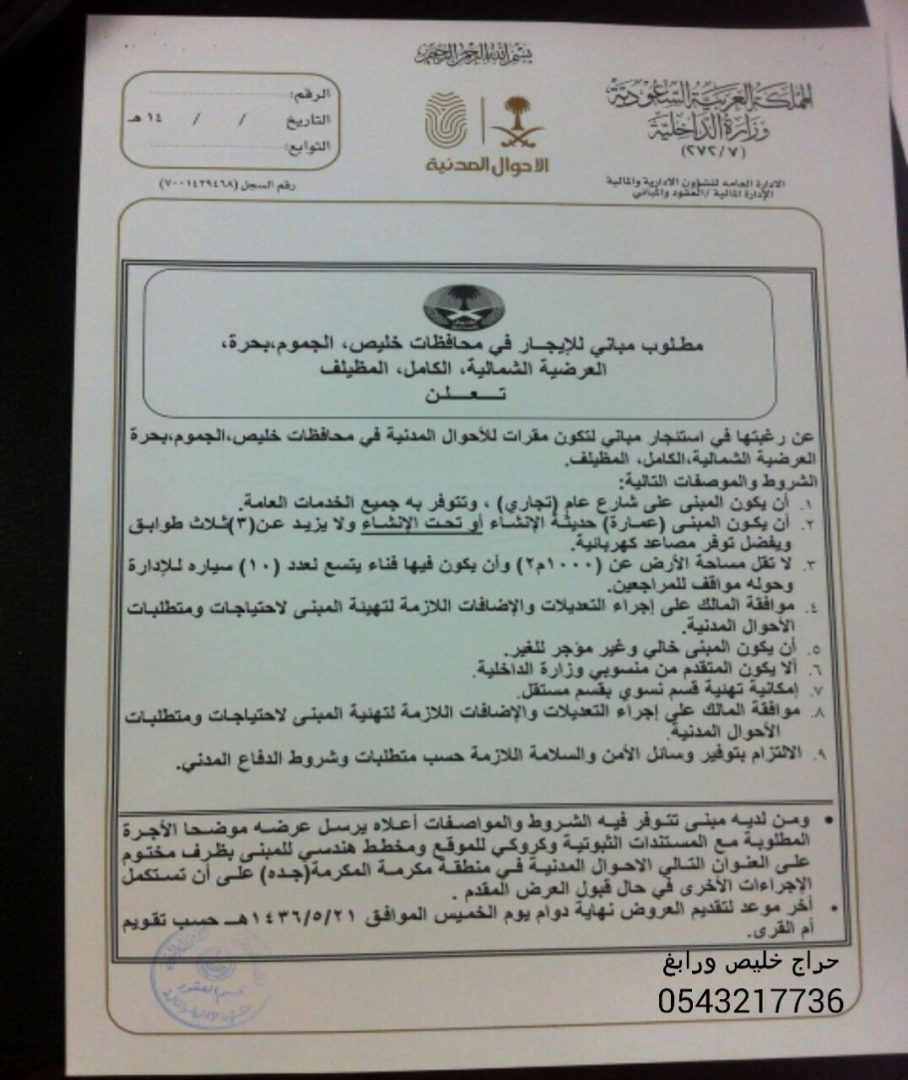 صحيفة غراس الإلكترونية > الأخبار المحلية > الداخلية تبحث عن مبنى للأحوال المدنية بخليص والكامل الداخلية تبحث عن مبنى للأحوال المدنية بخليص والكامل الكاتب: متابعات 24 فبراير, 2015م 0 15689 أعلنت وزارة الداخلية عن رغبتها في استئجار مبنى للأحوال المدنية بعدد من المحافظات منها محافظة خليص ومحافظة الكامل وفق مواصفات حددته الوزارة في الإعلان أدناه :
