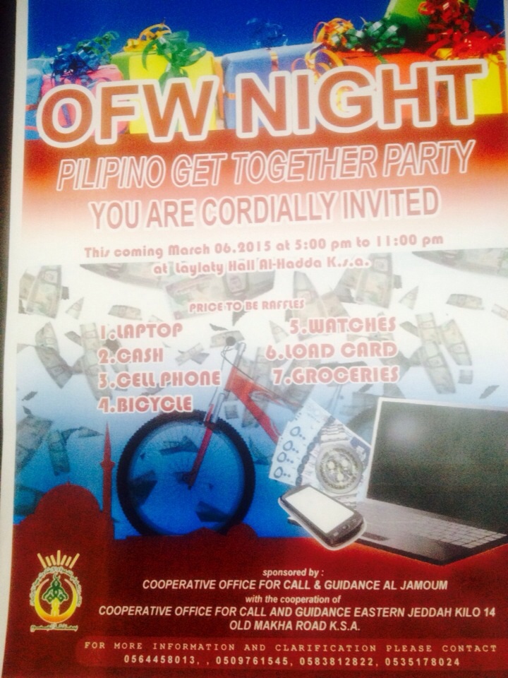 ينظم المكتب التعاوني للدعوة والإرشاد وتوعية الجاليات بالجموم ملتقى للجالية الفلبينية العاملة في الشركات والمؤسسات بالمحافظة يشتمل على عدد من الفعاليات مثل المحاضرات والمسابقات والجوائز والأنشطة التي تجمع بين الترفيه والفائدة. يقام الملتقى بقاعة ليلتي بحداء يوم الجمعة ١٥ جمادى الأولى.