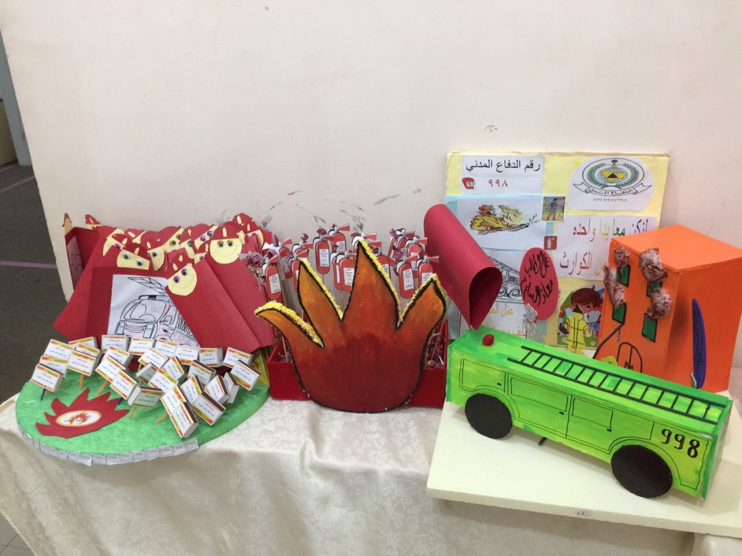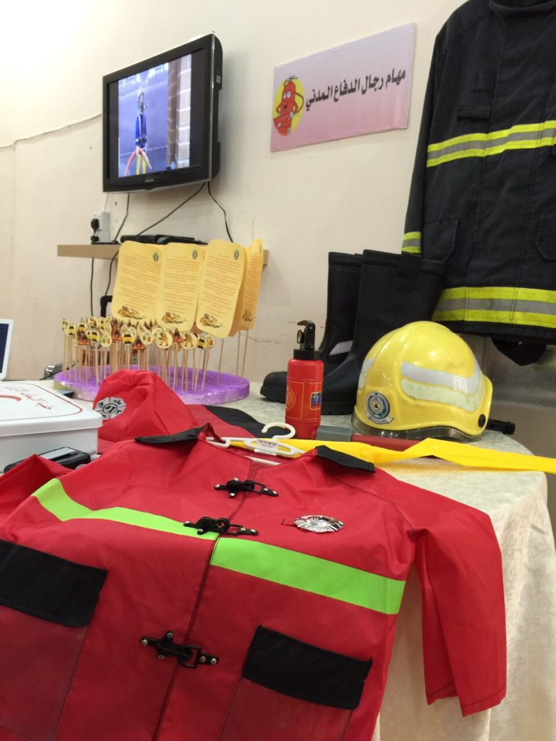 ٤. ركن المعرض حيث عرضت فيه ملابس الدفاع المدني وسيارات للدفاع المدني.