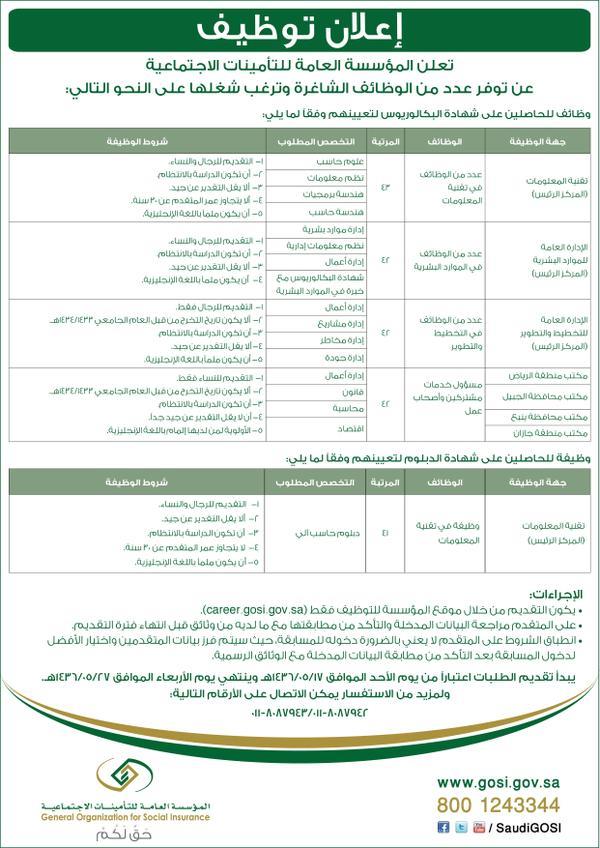 وشملت الوظائف في مجالات الإدارة وتقنية المعلومات والموارد البشرية والتخطيط والتطوير وخدمات المشتركين، على أن يتم تقديم الطلبات سيبدأ اعتباراً من اليوم الأحد، حتى يوم الأربعاء الموافق 27/ 5/ 1436هـ، وذلك عبر موقعها الخاص بالتوظيف www.career.gosi.gov.sa