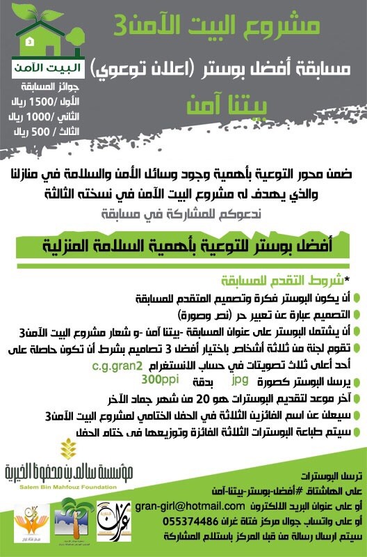 ٣- أن يشتمل البوستر على عنوان المسابقة – بيتنا آمن وعلى شعار مشروع البيت الامن ٣