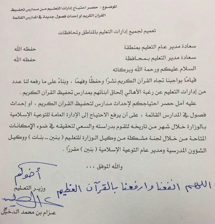 وهمش وزير التعليم على خطاب التعميم : اللهم انفعنا وارفعنا بالقرآن العظيم.