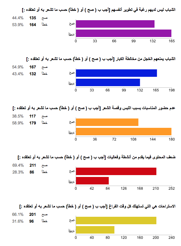 – يمتنع بعض الشباب عن المشاركه بسبب ما يدور ويسمع من حديث الناس في المجالس من انتقادات وسخريه حول القائمين على المناشط والفعاليات لهذا يفضل اﻻبتعاد