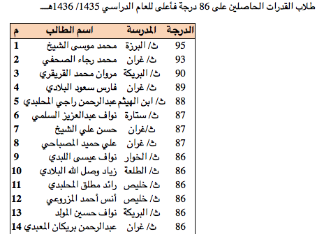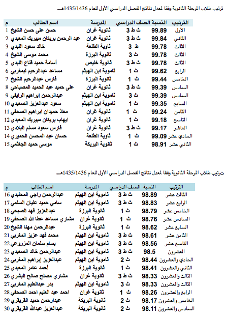 أسماء الطلاب المتفوقين (حسب ما ورد في كتيب دليل أوائل المتفوقين والمتفوقات) :