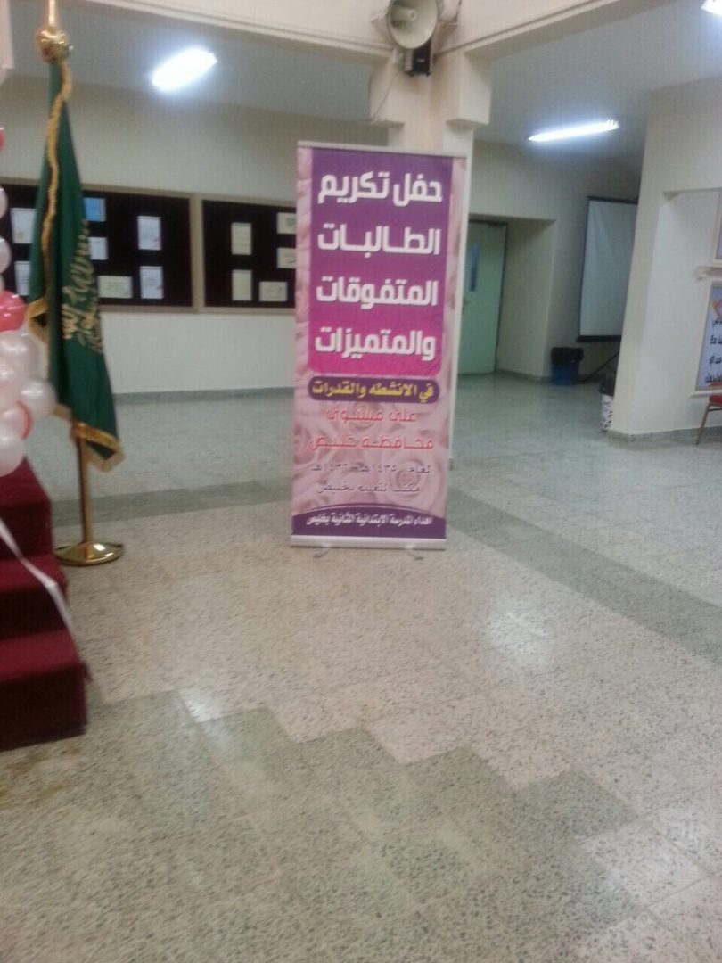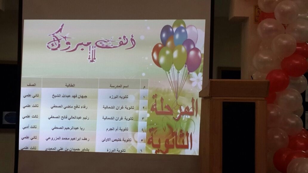 على شرف مديرة ادارة التوجيه والارشاد الاستاذة حياة المطوع تم صباح الثلاثاء 7/2 تكريم ٩٨ طالبة من الطالبات المتفوقات على مستوى مكتب تعليم خليص في الانشطة الثقافية والعلمية وبحضور رئيسة الشؤون التعليمية بمكتب التربية والتعليم بخليص الأستاذة زكية الصبحي وعدد من المشرفات التربويات بالمكتب أمهات الطالبات ومديرات المدارس والمرشدات الطلابيات بدأ الحفل القرآن الكريم والنشيد الوطني ثم أنشودة ترحيبية مقدمة من المدرسة الثالثة الإبتدائية بخليص أعقب ذلك مسيرة للطالبات أوبريت مقدم من ابتدائية أم الجرم عن الوطن وكلمة للمتفوقات وكلمة للأمهات .القت بعدها الاستاذة حياة المطوع كلمة شكرت فيها مكتب التربية والتعليم بخليص وهنأت الطالبات المتفوقات وامهاتهن بهذه المناسبة. بعد ذلك تم تقديم انشودة وطنية تلاها تكريم الطالبات المتفوقات.
