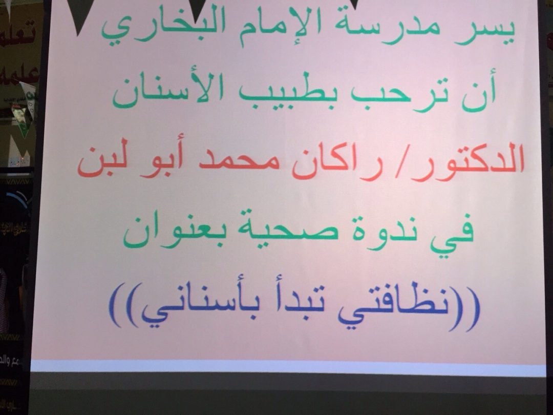 أقامت مدرسة الامام البخاري ندوة صحية بعنوان ( صحتي تبدأ بأسناني ) و التي ألقاها طبيب الاسنان بمركز صحي أم الجرم .. الدكتور / راكان محمد أبو لبن ، حيثُ ألقى ندوة تثقيفية عن الاسنان