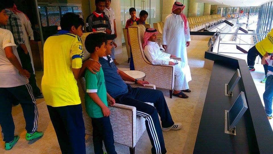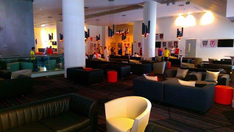 وكان في إستقبالهم خالد محمد الجريفاني مدير مكتب إدارة الملعب ، والأستاذ خالد الشريف ، واﻷستاذ نزار قباني مشرف الخدمات ، والذين رحبوا بالجميع أجمل ترحيب ، ثم قاموا بإطلاع الزائرين على مرافق ملعب الجوهرة والتي كانت على النحو التالي :