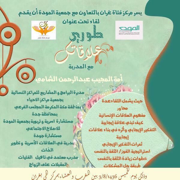 وجه مركز فتاة غران الدعوة لجميع سيدات المجتمع لحضور اللقاء الإجتماعي (طوري علاقاتك ) ، بقيادة المدربة أمة المجيب عبد الرحمن الشامي مديرة البرامج و المشاريع للمراكز النسائية بجمعية مراكز الأحياء بمنطقة مكة المكرمة المجلس الفرعي بمحافظة جدة ، والمستشارة الأسرية و التربوية بجمعية المودة للإصلاح الإجتماعي ومستشارة الجودة والمدربة في العلاقات الأسرية وتطوير الذات ، والمدربة في تأهيل الفتيات المقبلات على الزواج ، وسيكون اللقاء مابين صلاة المغرب والعشاء ليوم الخميس ٣ شعبان بمركز أحياء غران الرجالي ، وسيتناول المحاور التالية :