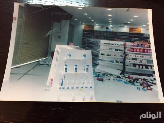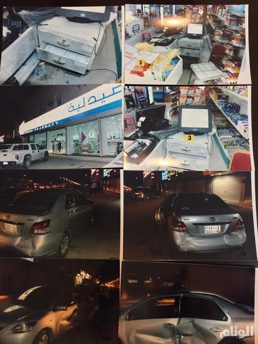كما تلقى مركز شرطة النظيم بلاغًا من وافد مصري الجنسية عن قيام أربعة أشخاص يستقلون السيارة نفسها بصدم باب الصيدلية التي يعمل بها واقتحامها وإشهار سلاح ناري محاولين السرقة ثم لاذوا بالفرار.