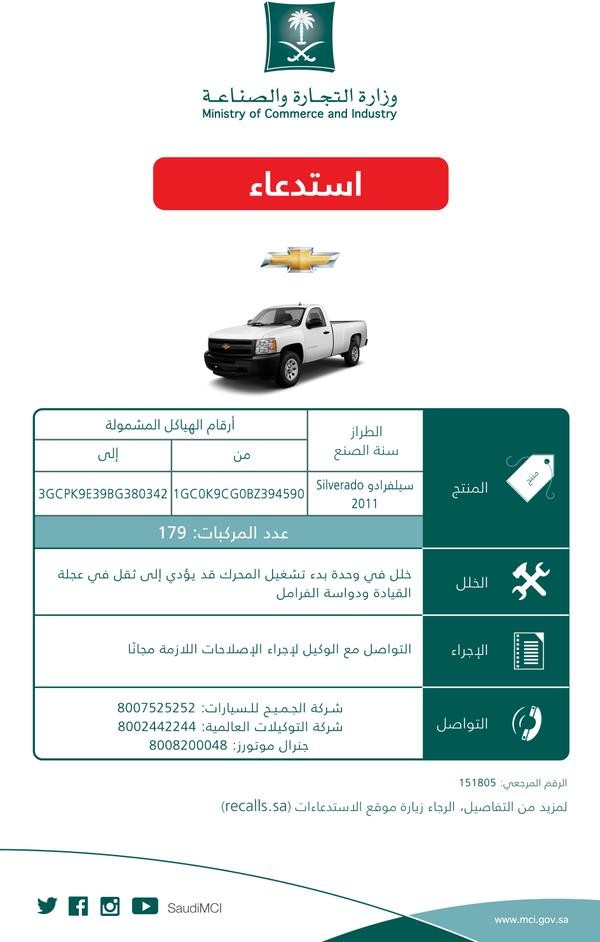 إستدعت وزارة التجارة والصناعة ، سيارات “شيفروليه (تاهو وسيلفرادو)” موديلات 2011م لوجود خلل في “السِلف” قد يؤدي إلى ثقل في عجلة القيادة ودواسة الفرامل.