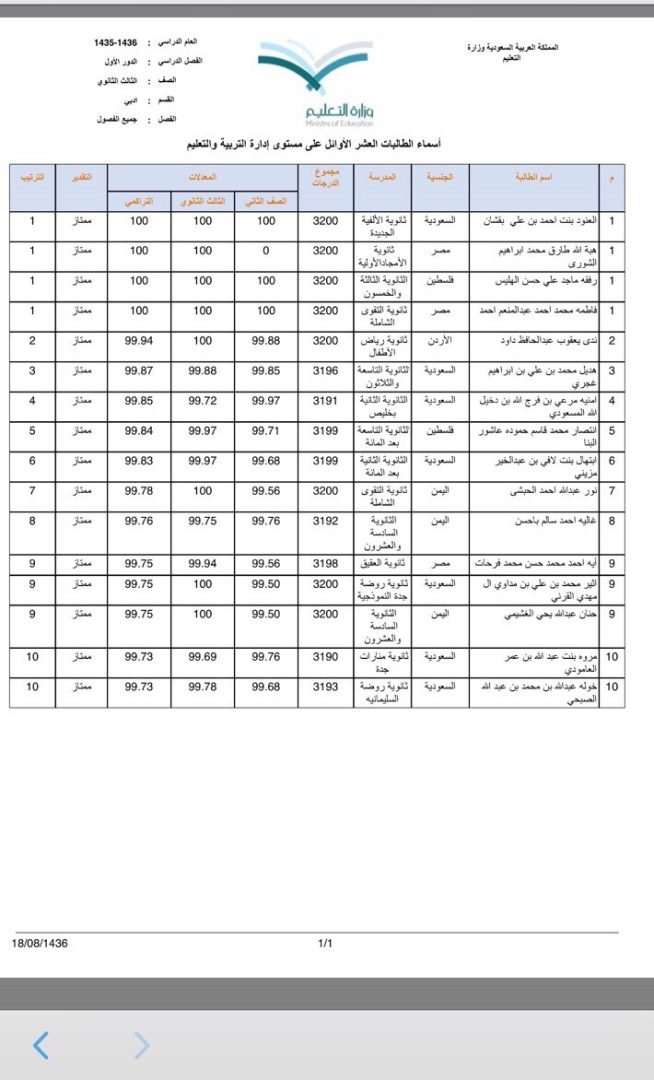 صحيفة غراس الإلكترونية > التربية والتعليم > الطالبة أمنية المسعودي تحقق المركز الرابع على مستوى تعليم جدة الطالبة أمنية المسعودي تحقق المركز الرابع على مستوى تعليم جدة الكاتب: آمال الشيخ 06 يونيو, 2015م 0 11873 حققت الطالبة أمنية مرعي بن فرج الله المسعودي بالثانوية الثانية بخليص الترتيب الرابع ضمن العشر الأوائل على مستوى إدارة تعليم جدة وحصلت على نسبة ٩٩.٨٥٪ بتقدير ممتاز.