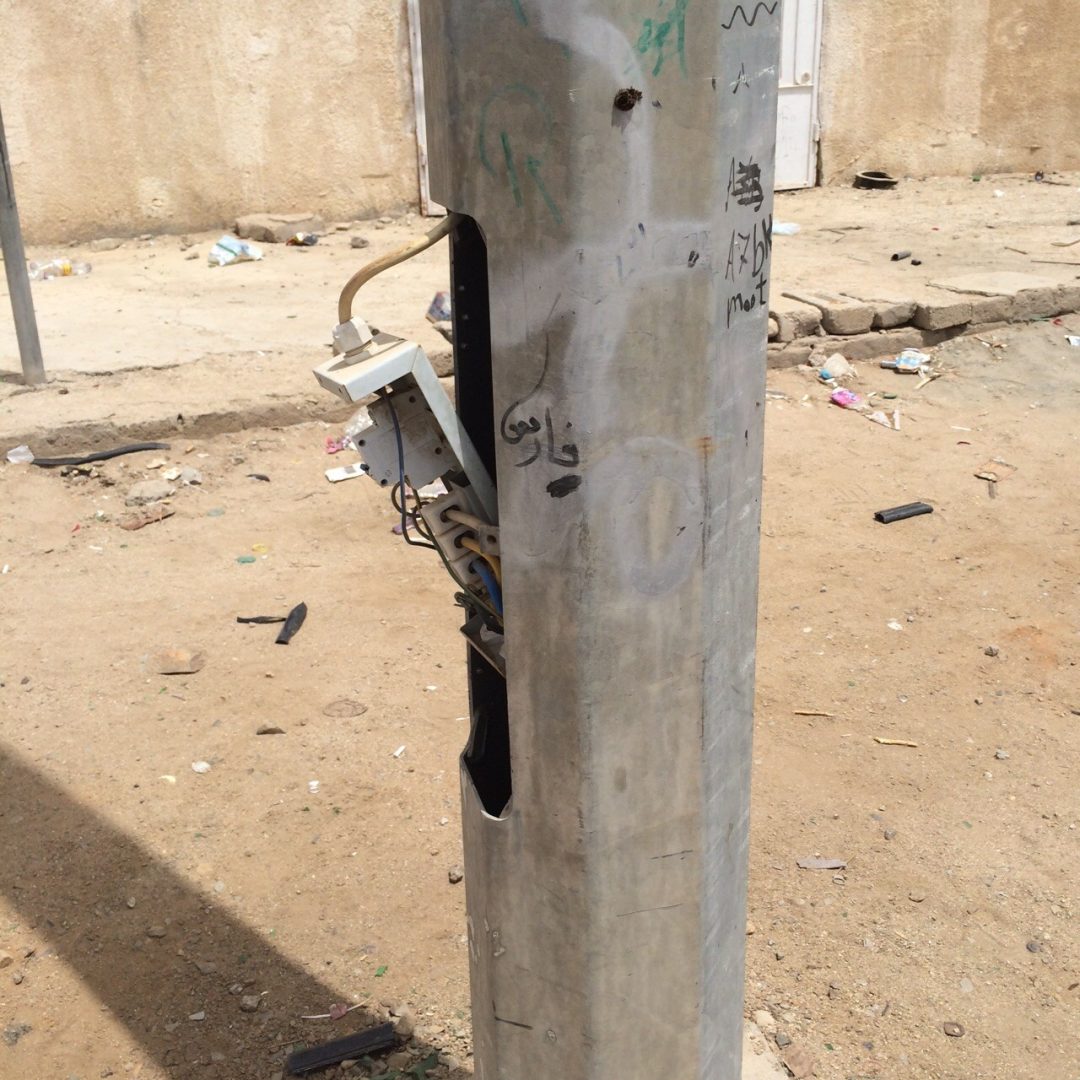 فقبل فترة تعرض أحد أعمدة الكهرباء على طريق الشعب الجنوبي إلى حادث اصطدام من قبل أحد المركبات مما أدى إلى إلحاق ضرر كبير بالعمود وانحنائه (كما هو موضح في الصورة أدناه) و أصبح يهدد مرتادي الطريق في حالة سقوطه في أي لحظة بسبب الرياح أو الأمطار ناهيك عما سيحدث عنه من انقطاع للتيار الكهربائي.