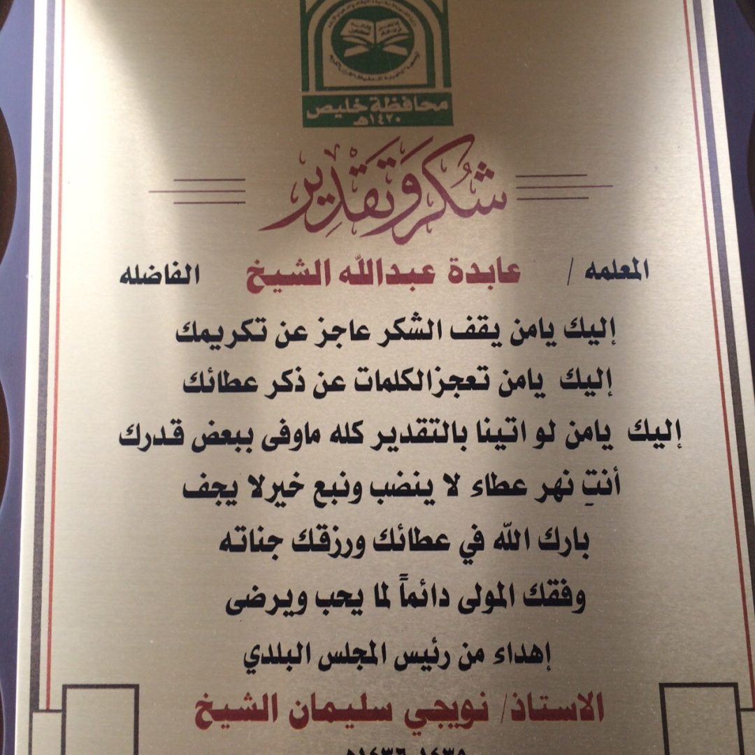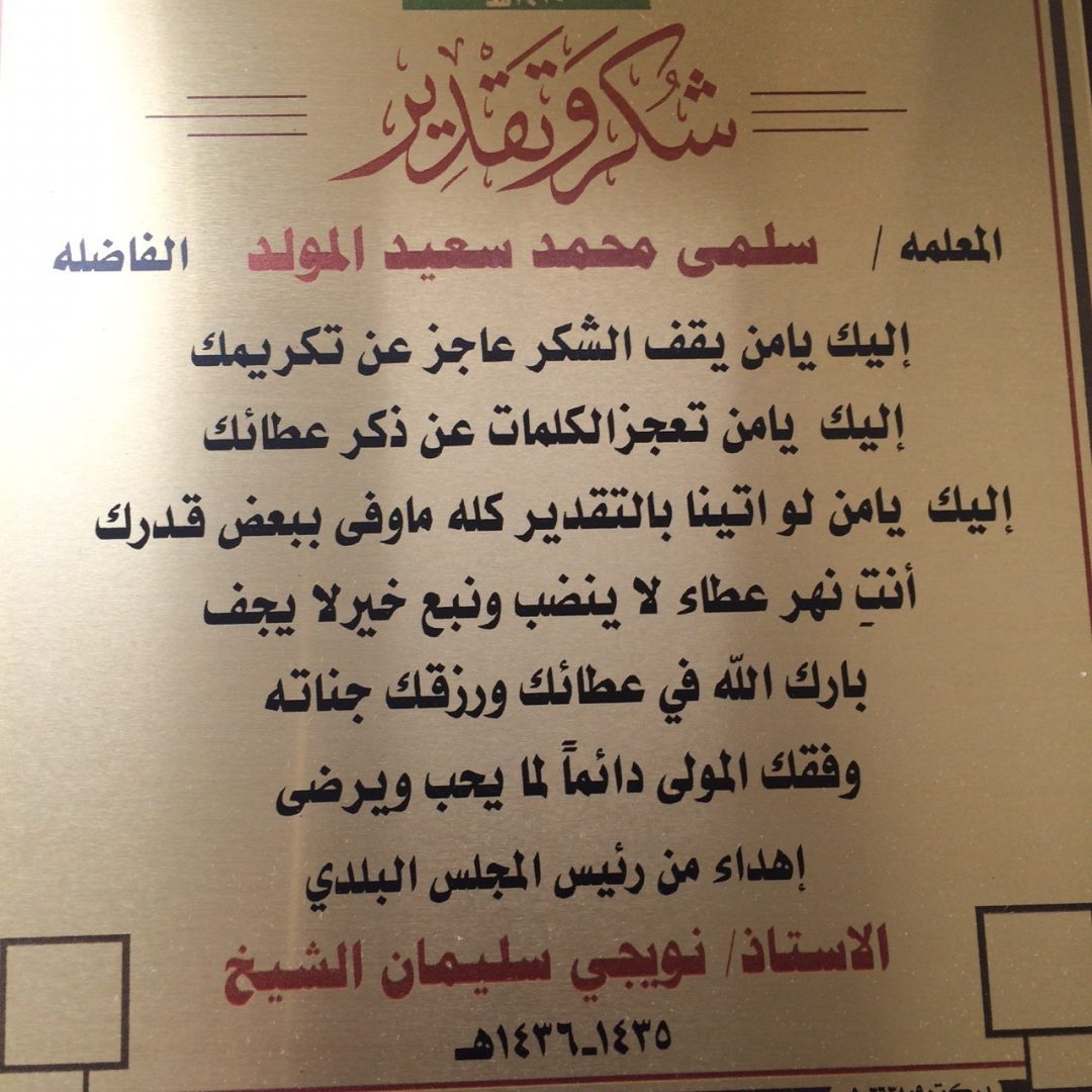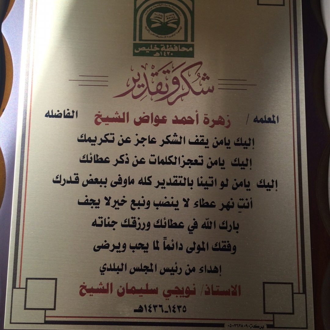 صحيفة غراس الإلكترونية > الأخبار المحلية > أهالي البرزة يكرمون معلمات التحفيظ أهالي البرزة يكرمون معلمات التحفيظ الكاتب: بدر سالم الشيخ 20 يونيو, 2015م 0 12258 أقام أهالي البرزة تكريماً خاصاً لعدد من معلمات الدور وحلقات التحفيظ في أحياء البرزة حيث قدم الشيخ نويجي بن سليمان الشيخ رئيس المجلس البلدي سابقاً ، دروعاً تذكارية ومكافآت مالية تكريماً وتشجيعاً لهن على ما بذلنه من جهد في تعليم وتحفيظ القرآن الكريم للطالبات ، وقد أقيم حفل التكريم بدار الرميصاء بحي الصمد .
