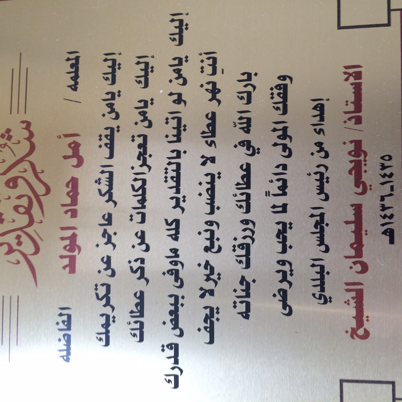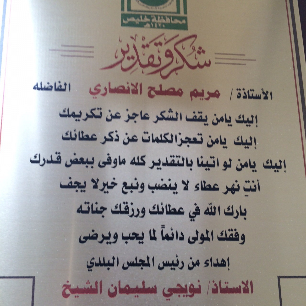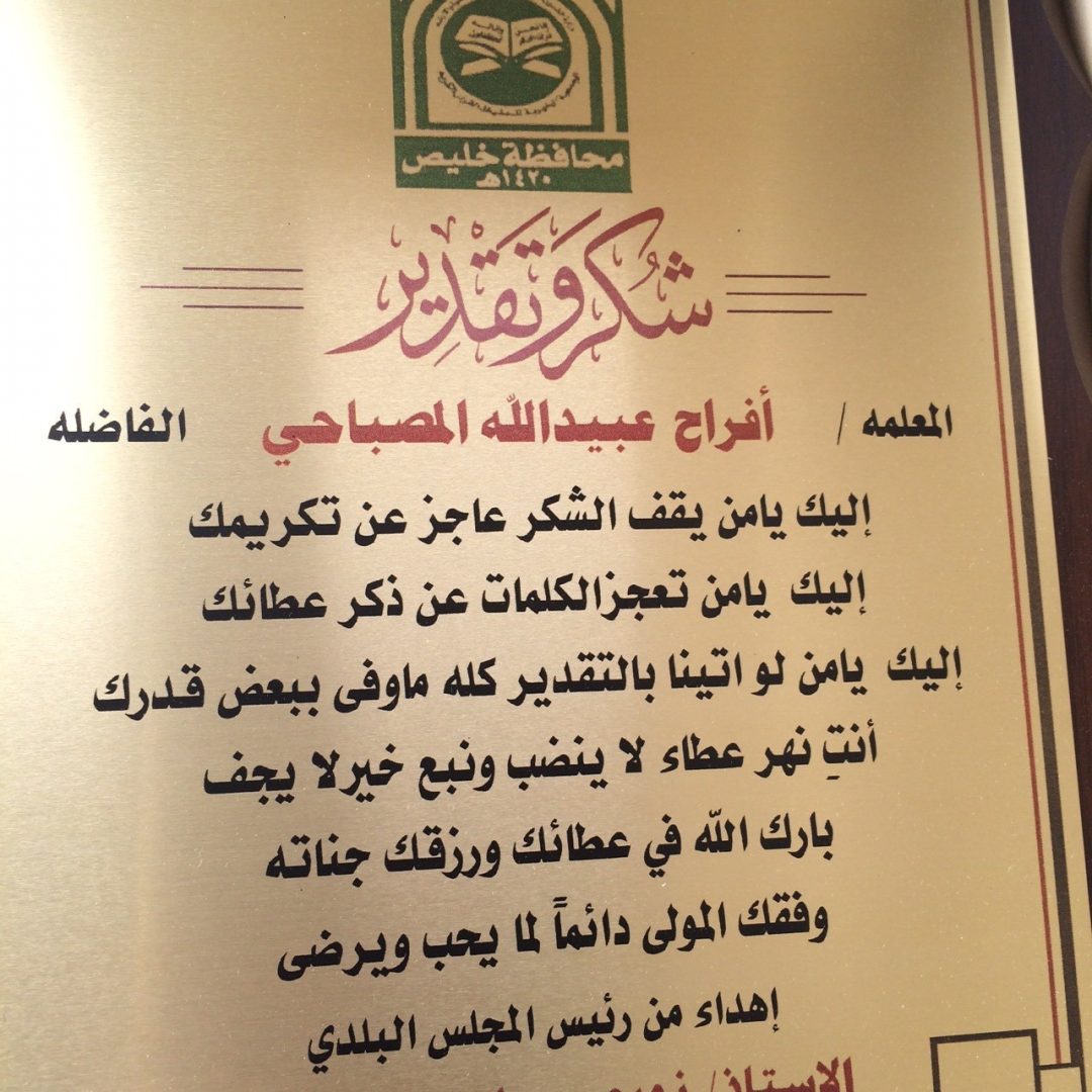 صحيفة غراس الإلكترونية > الأخبار المحلية > أهالي البرزة يكرمون معلمات التحفيظ أهالي البرزة يكرمون معلمات التحفيظ الكاتب: بدر سالم الشيخ 20 يونيو, 2015م 0 12258 أقام أهالي البرزة تكريماً خاصاً لعدد من معلمات الدور وحلقات التحفيظ في أحياء البرزة حيث قدم الشيخ نويجي بن سليمان الشيخ رئيس المجلس البلدي سابقاً ، دروعاً تذكارية ومكافآت مالية تكريماً وتشجيعاً لهن على ما بذلنه من جهد في تعليم وتحفيظ القرآن الكريم للطالبات ، وقد أقيم حفل التكريم بدار الرميصاء بحي الصمد .