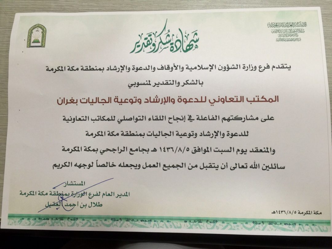 تلقى المكتب التعاوني للدعوة والإرشاد وتوعية الجاليات في غران شهادة شكر وتقدير من فرع وزارة الشؤون الإسلامية بمكة المكرمة على مشاركة المكتب في اللقاء التواصلي للمكاتب التعاونية للدعوة والإرشاء وتوعية الجاليات بمنطقة مكة المكرمة والذي عقد في الخامس من الشهر الماضي بجامع الراجحي بمكة المكرمة.