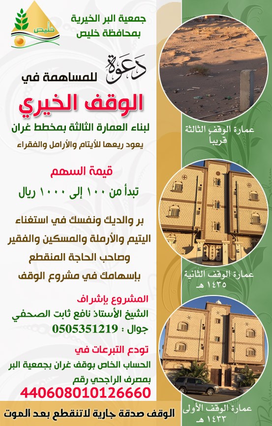 تم الإعلان عن فتح باب المساهمة في مشروع الوقف الخيري لبناء العمارة الثالثة بمخطط غران والتي سوف يعود ريعها لمساعدة الأيتام والأرامل والفقراء والمحتاجين.