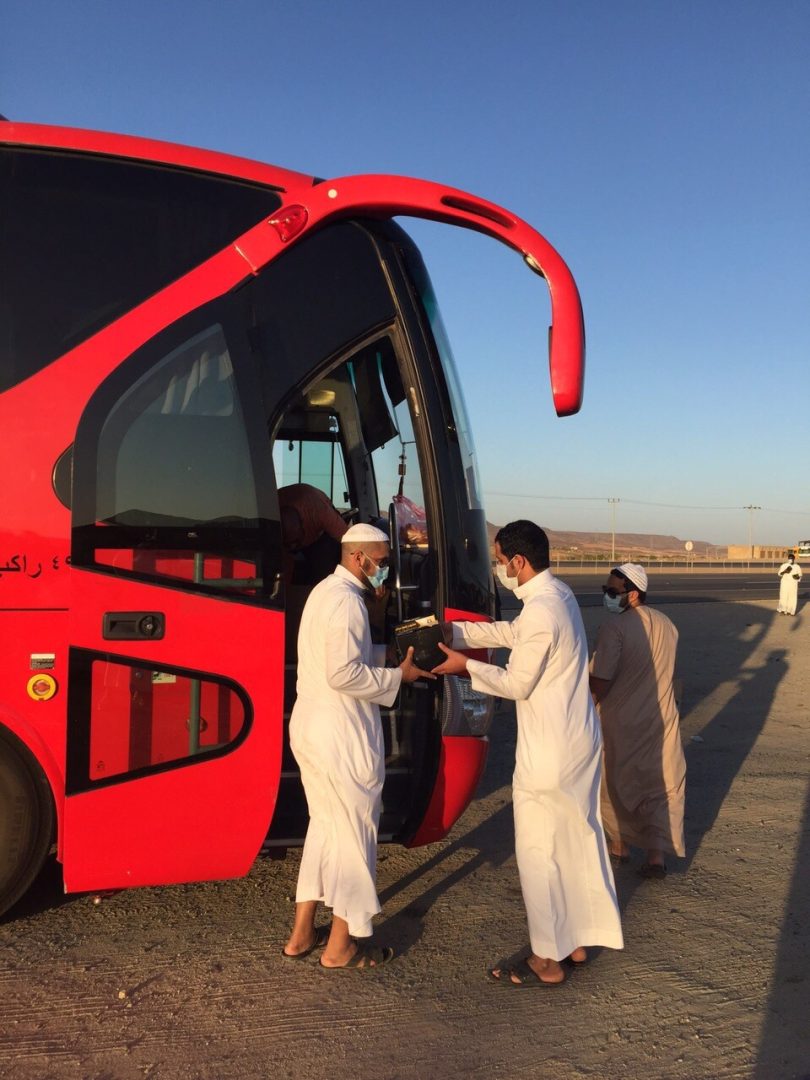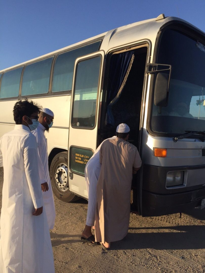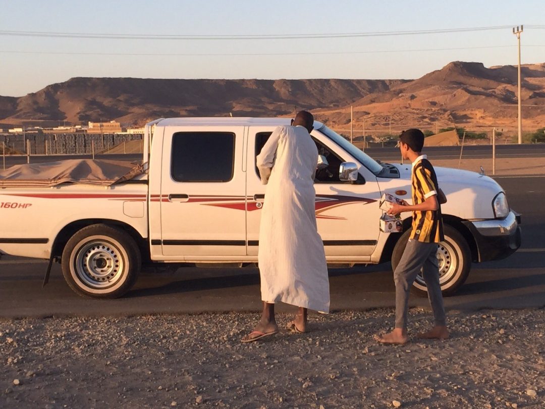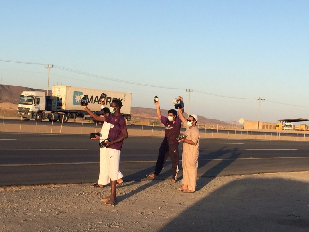 الشباب الذين جندوا أنفسهم لتقديم هذه الخدمة التطوعية يقومون بتناول إفطارهم في الميدان حرصاً منهم على توفير وجبة الإفطار لعابري الطريق من المعتمرين والمسافرين في اللحظات الأخيرة المتزامنة مع الإفطار والتي تليه.