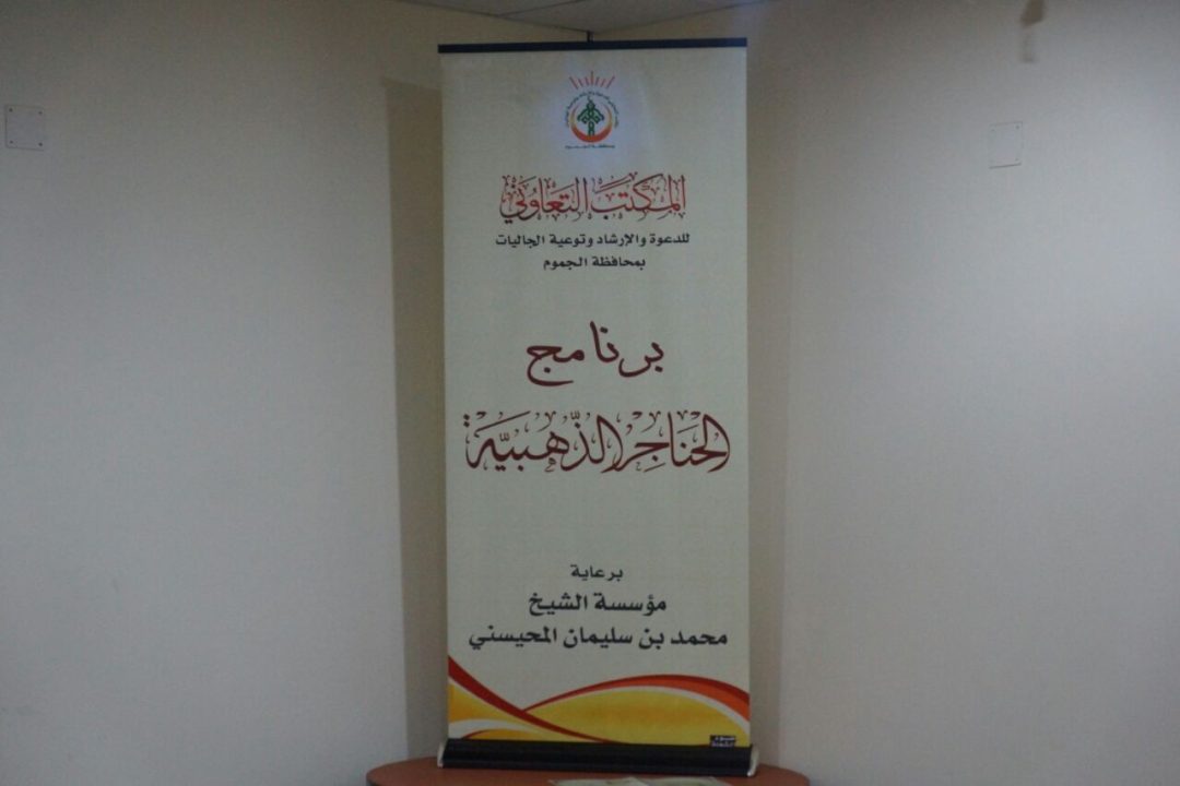 يقيم المكتب التعاوني للدعوة والإرشاد وتوعية الجاليات بالجموم برنامج ” الحناجر الذهبية ” ، والذي يستهدف أئمة المساجد وعددهم 74 إماماً ، بدعم من مؤسسة الشيخ محمد بن سليمان المحيسني للإستثمار ، حيث يحتوي البرنامج على أربعة لقاءات سوف تقام خلال شهر رمضان المبارك ، وأربعة أخرى عقب شهر رمضان ، وذلك بقاعة الدورات بجمعية تحفيظ القران الكريم ، والتي إنطلقت يوم الأربعاء 1436/9/14 هجري.