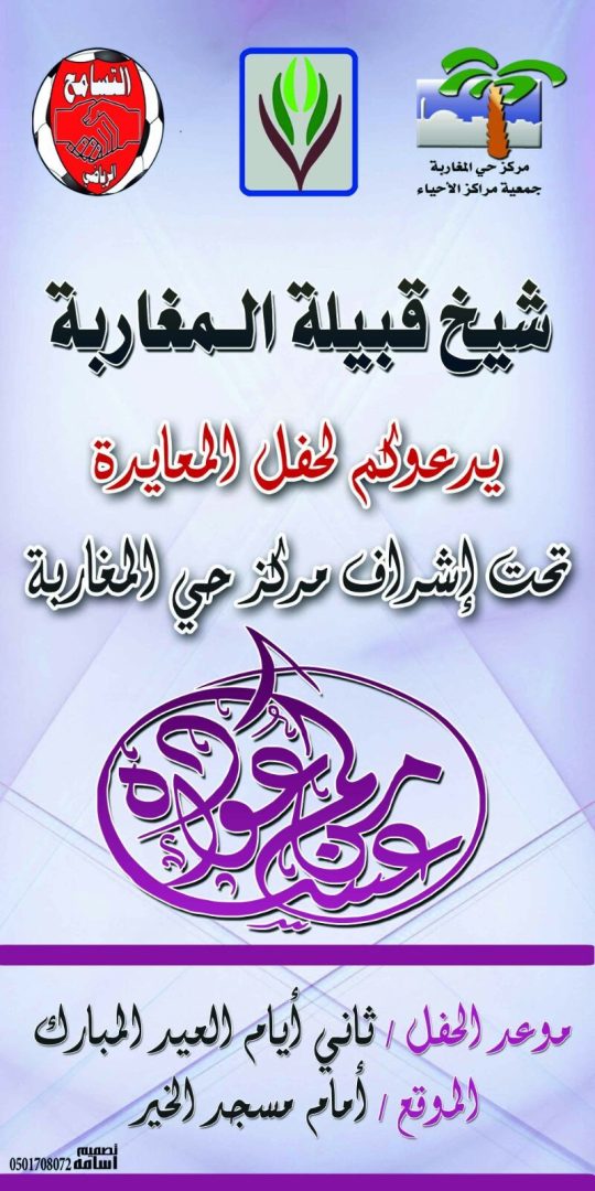 بمناسبة قدوم عيد الفطر المبارك يدعوكم الشيخ غازي عبد الهادي المغربي ، شيخ قبيلة المغاربه ، وبالتعاون مع مركز حي المغاربه ومركز التسامح للنشاط الإجتماعي ، والتابع للجنة التنمية الإجتماعية الأهلية بخليص ، للمعايدة بحي المغاربه وذلك مساء ثاني أيام عيد الفطر السعيد ، بجوار مسجد الخير وأمام منزل الشيخ غازي ، حيث سيكون هناك عدداً من الفقرات المشوقه إن شاء الله ..