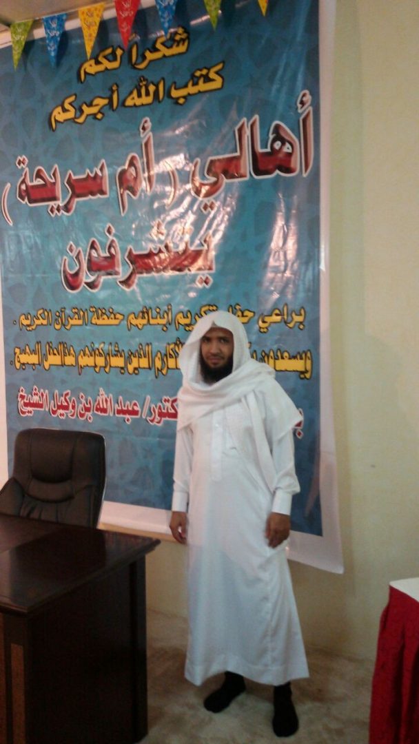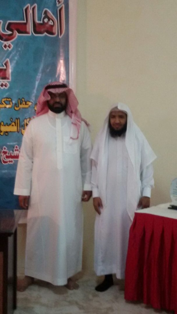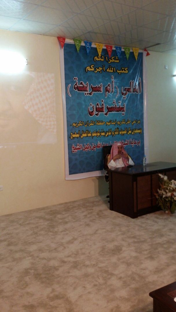 على شرف الأستاذ الدكتور عبدالله بن وكيل الشيخ ، والأستاذ حمزة عابد الصبحي رئيس جمعية تحفيظ القران الكريم بخليص، ومدير الجمعيه عبدالرحيم عبدالعليم الصحفي ، والدكتور صلاح الشيخ ، وعدد من أهالي أم سريحة وأم الجرم ، وذلك لتكريم ابن “أم سريحة” الذي أتم حفظ كتاب الله الكريم ، وهو المعلم الأستاذ رضا صالح عبدالحكيم الشيخ ، حيث كان التكريم من قبل عمه عبدالله عبدالحكيم الشيخ .