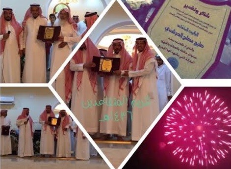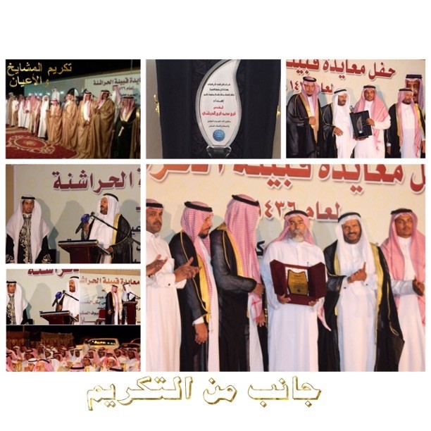 ثم قام رئيس المجلس ونائبه أ/ معتاد صالح الحرشني ، وأعضاء مجلس الحي وبترتيب من اللجنة الإعلامية من أبناء القبيلة برئاسة صالح عابد الحرشني ، بتكريم شيخ القبيلة د/مبارك الحرشني ، وتكريم أعيان ومشايخ القبيلة وتقديم الهدايا التذكارية ، أعقبها تكريم الحاصلين على درجة الدكتوراه والماجستير والحاصلين على شهادتي الطب والهندسة من أبناء القبيلة ، وتقديم الدروع التذكارية لهم ، وتكريم العميد/ محمد حميد الحرشني ، وتكريم شكر ووفاء للمعلم المتقاعد المتميز علماً وأخلاقاً والذي تخرج على يده معظم أبناء القبيلة أ/ بخيّت علي الحرشني ، كتحية حب ووفاء للمعلم القدير .