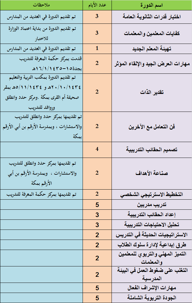 – تقديم دورة فن التعامل مع الآخرين والتأثير فيهم بمدرسة الأرقم بن أبي الأرقم المتوسطة بمكة المكرمة 26/11/1434هـ .