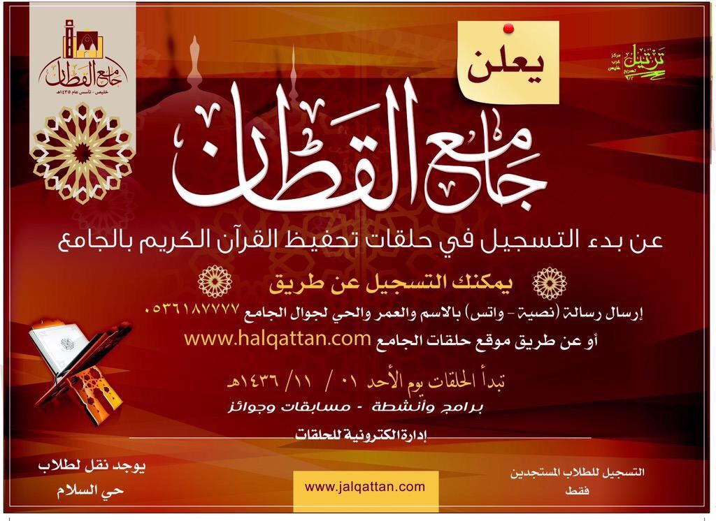 يعلن جامع القطان بخليص عن بدء التسجيل في حلقات تحفيظ القران الكريم بالجامع ، وذلك إعتباراً من يوم الأحد ١-١١-١٤٣٦هـ ، أما البداية الفعلية للحلقات سوف تبدأ يوم الأحد 8-11-1436هـ .